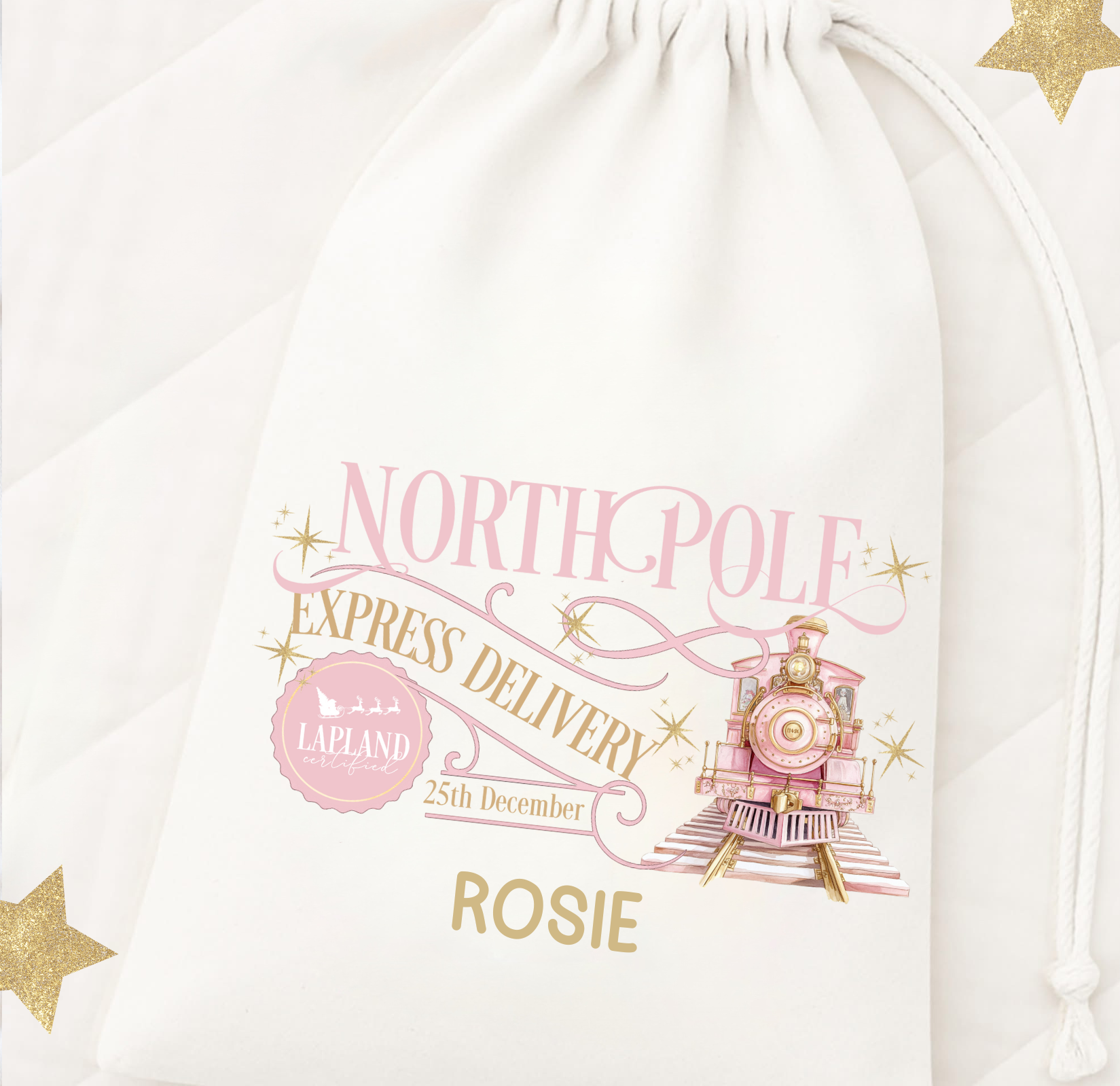 The cutest printed Polar Express Gift Sack. The perfect gift this Christmas, fill with goodies and there’s no need for a gift bag, they make the perfect keepsake! Personalised with a name. Available in Pink or Blue
